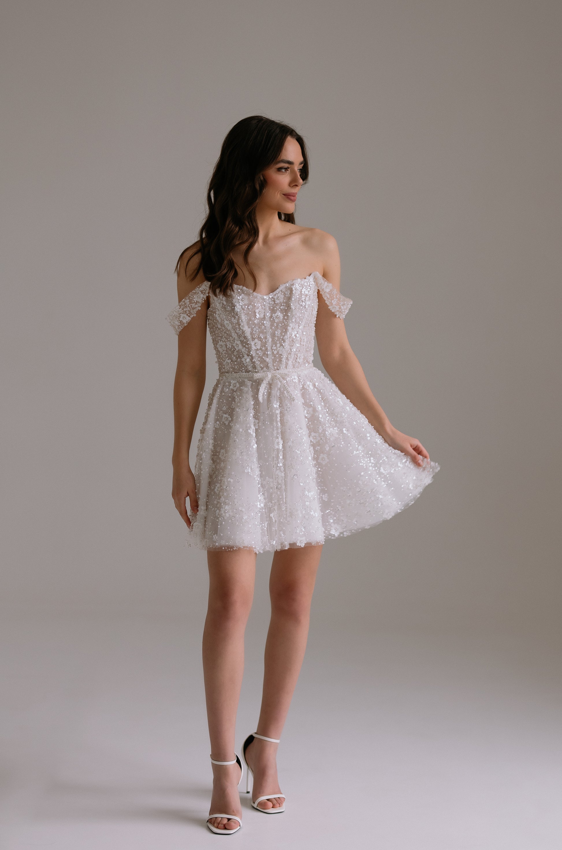Carrie – a stunning mini wedding dress adorned with sequin flowers, beads, and pearls, exuding elegance from every stitch. With its structured top and soft A-line skirt, this beautiful gown offers a flattering silhouette that sparkles softly from every angle. Perfect as an engagement dress, bridal shower dress or wedding reception dress for dancing the night away, Carrie embodies timeless beauty and sophistication.