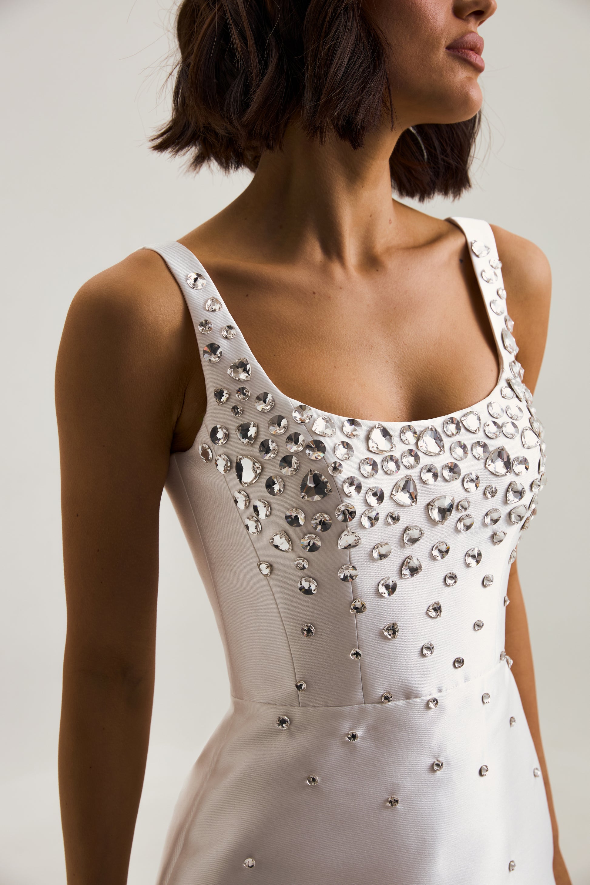 Evelyn – a stunning mini wedding dress crafted from luxurious Mikado fabric, known for its signature soft sheen. Beautifully hand embellished with crystals, it creates a mesmerizing sparkle with every movement. This dress combines timeless design with contemporary charm, making it a perfect choice for the modern bride. Evelyn is perfect as an engagement dress, bridal shower dress, or reception dress.