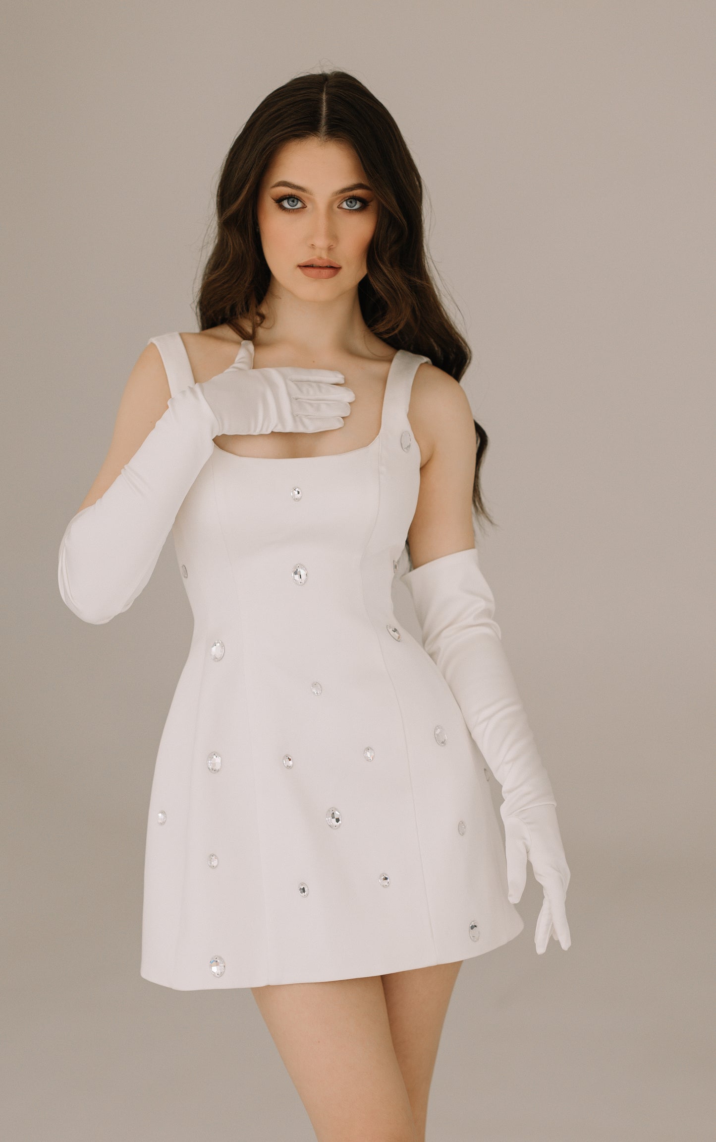 Everly dress, an embodiment of sophistication and style, is meticulously crafted from premium heavy satin and embellished with genuine Swarovski crystals. The maxi gloves add an incredible touch of charm and luxury to this beautiful dress. This unique garment is the ideal choice for a variety of bridal occasions, whether it be your engagement party, bridal shower, rehearsal dinner, or even as a chic second wedding dress.