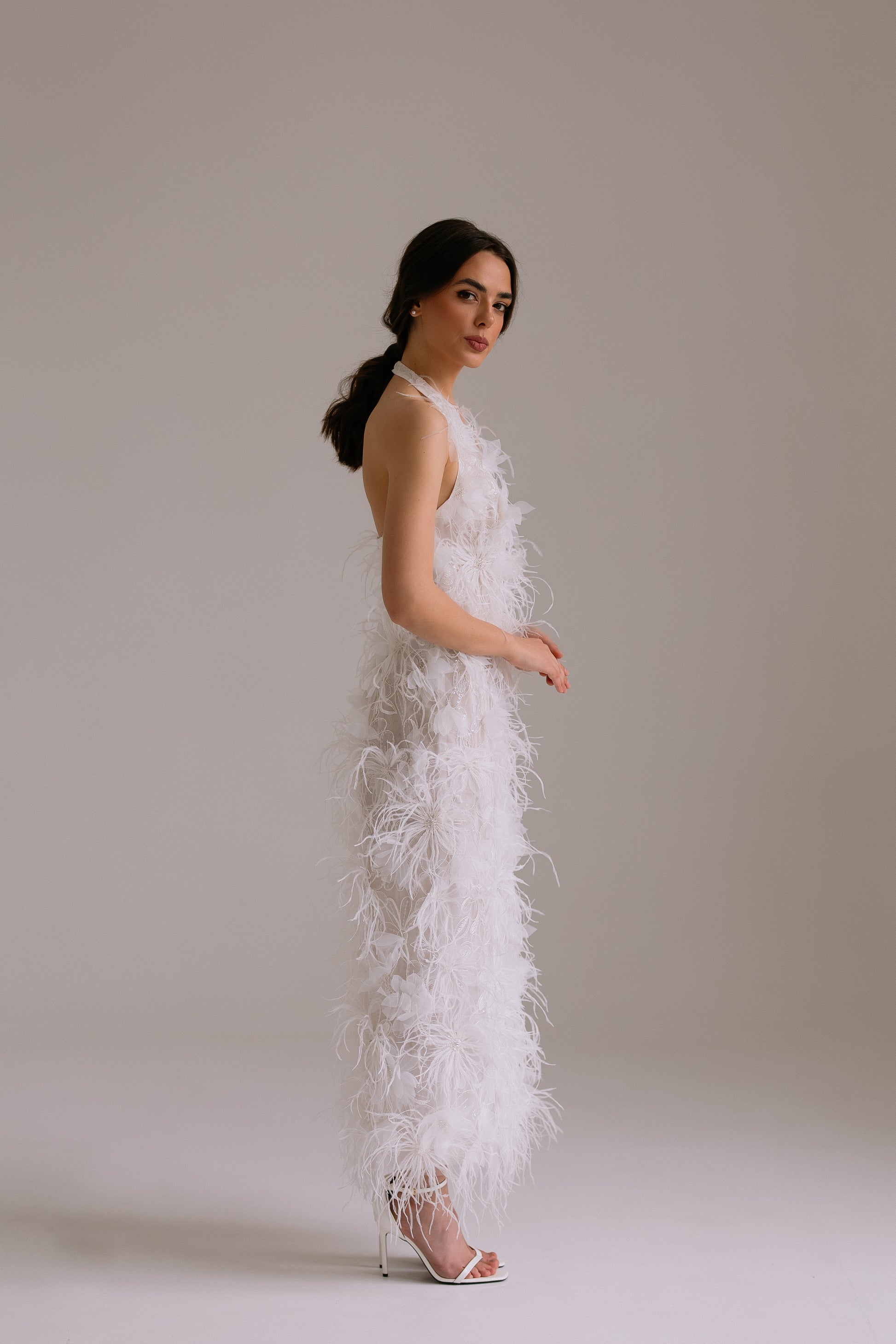 Lillian – a sophisticated midi wedding dress adorned with intricate 3D elements including feather flowers, delicate blooms, and shimmering beads. With its timeless silhouette and thoughtful details, this elegant gown exudes unparalleled charm and contemporary style. Perfect as a rehearsal dinner dress, engagement dress, or wedding reception dress for celebrating your special moments.