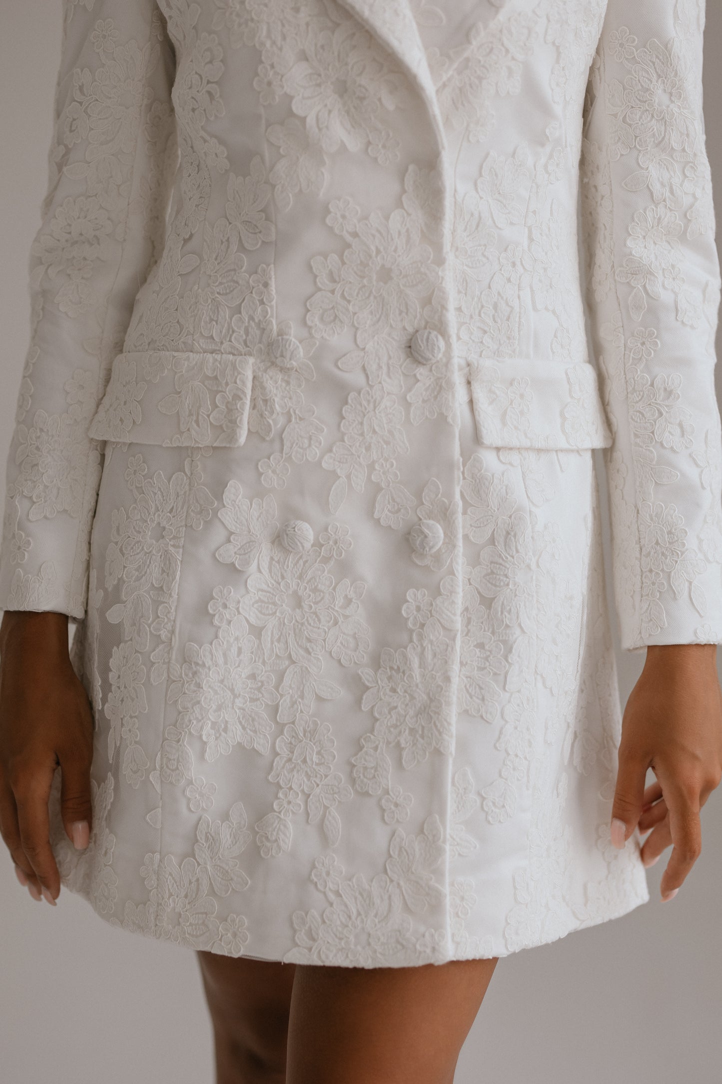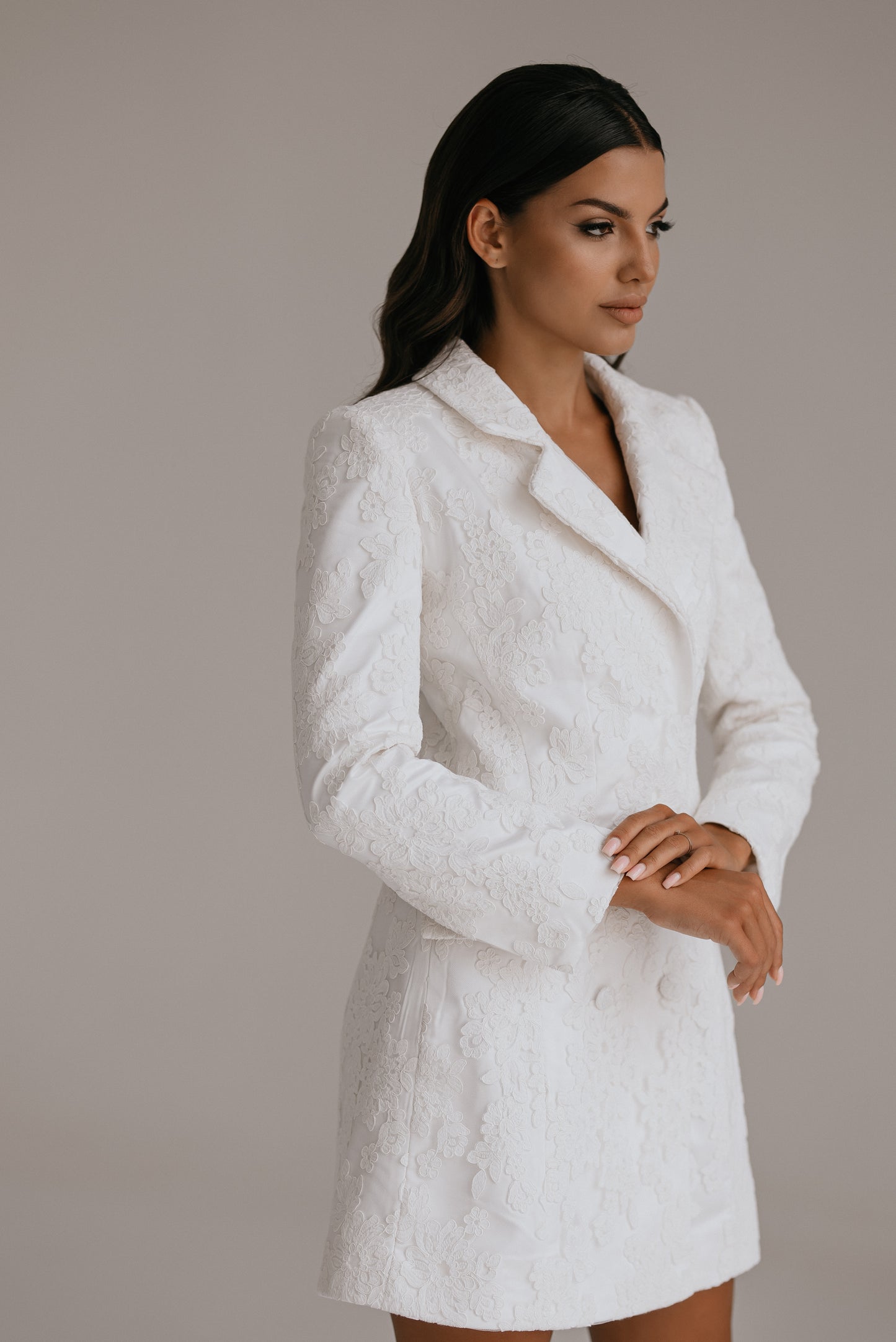 Maeve is a beautiful blazer dress that will be a head turner for any occasion, not just bridal. This gorgeous dress is made of premium heavy satin and is adorned with the finest lace. Maeve has a luxurious structure and keeps the shape flawlessly while offering maximum comfort. The sophisticated details include unique cuffs with tiny buttons, decorative pockets and front lace buttons.