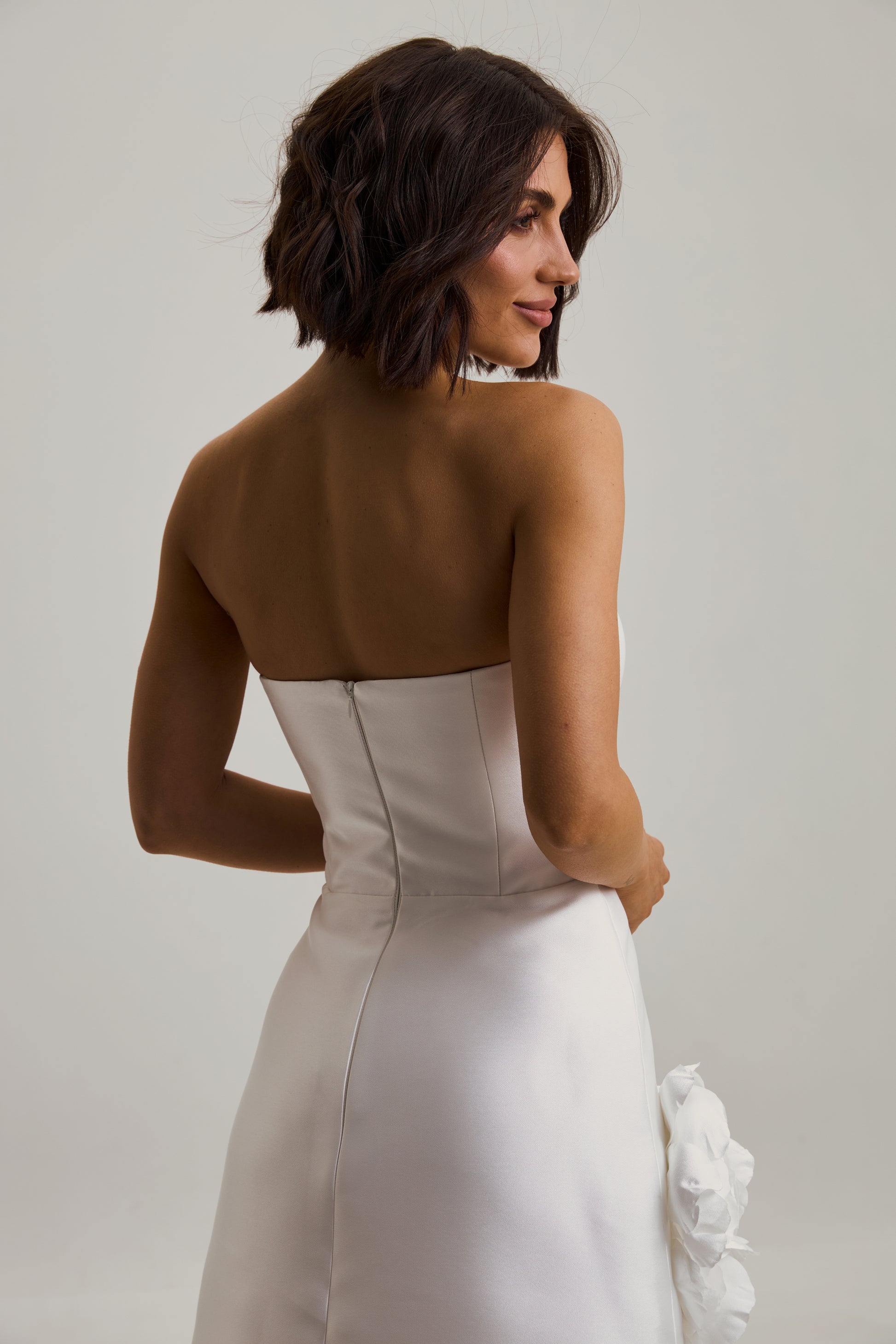 Peony – a breathtaking mini wedding dress crafted from luxurious Mikado fabric, known for its signature soft sheen. Adorned with voluminous handmade flowers, this stunning gown combines timeless elegance with modern charm. Featuring a perfectly fitted corset top and a structured skirt, this beautiful dress creates an unforgettable silhouette. Peony will be perfect as an engagement dress, bridal shower dress, or wedding reception dress.